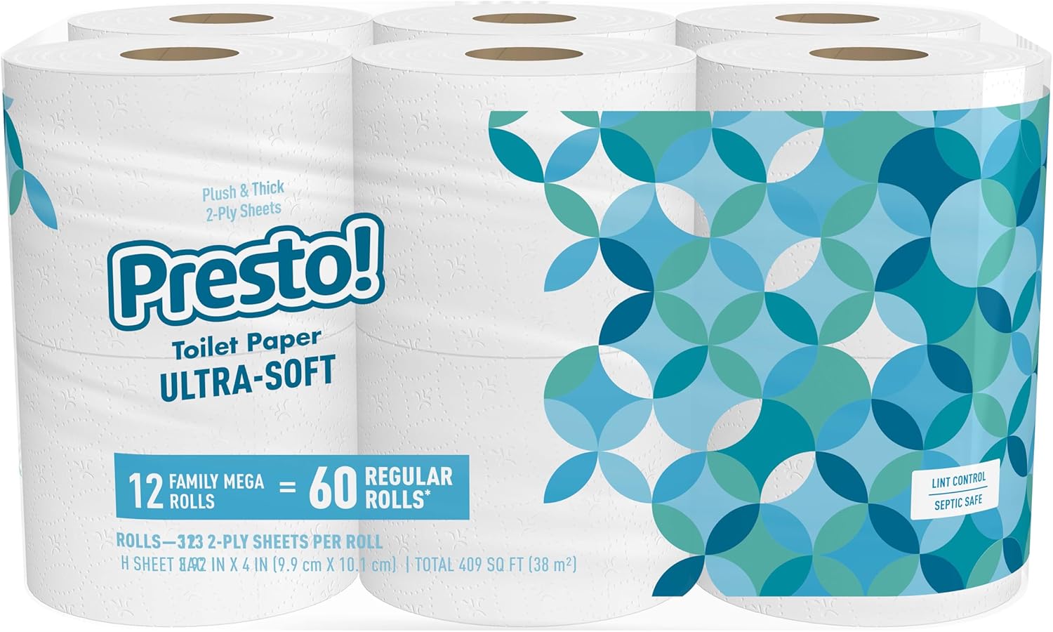 Amazon Brand - Presto! 2-Ply Ultra-Soft Toilet Paper, 24 Family Mega Rolls = 120 regular rolls, 6 Count (Pack of 4), Unscented