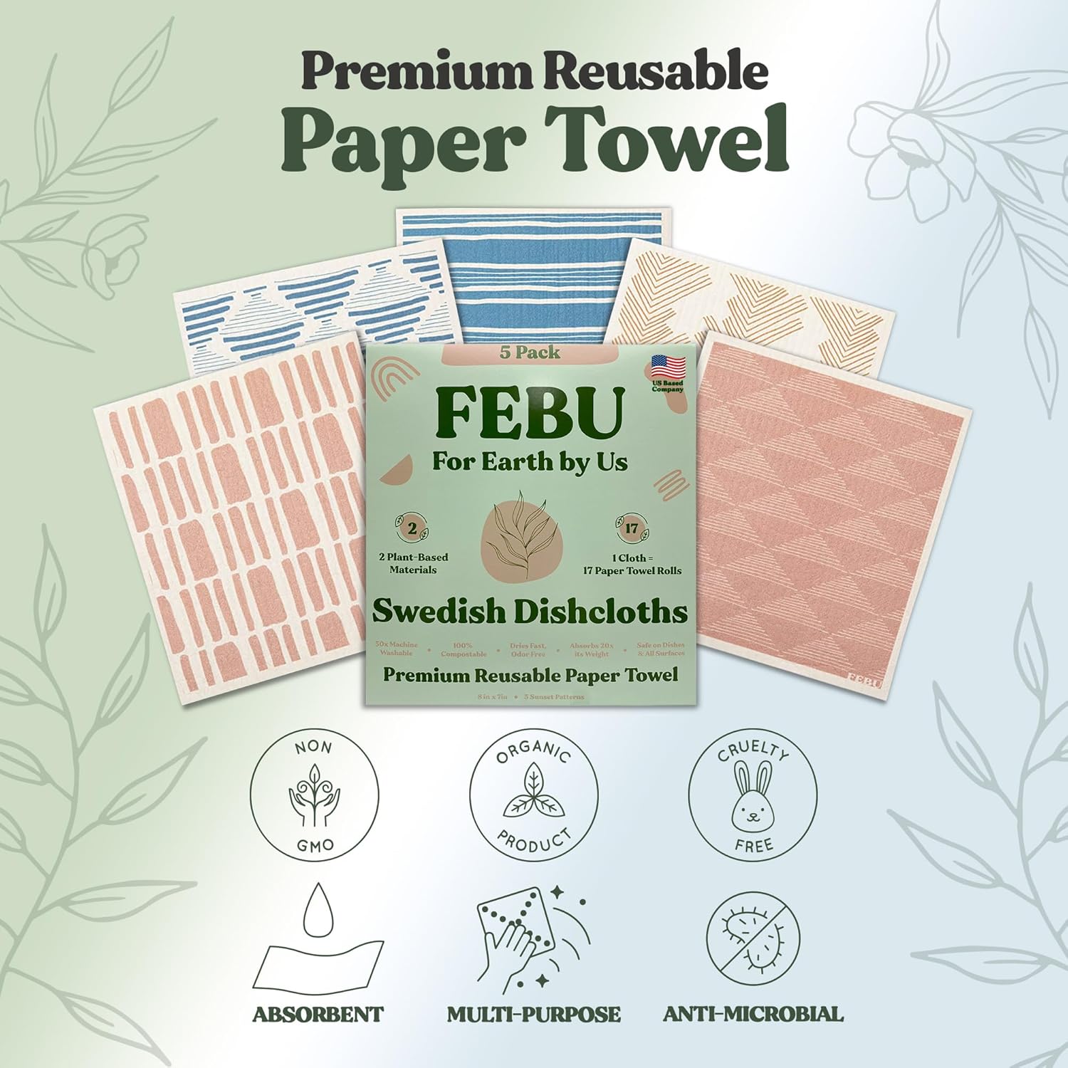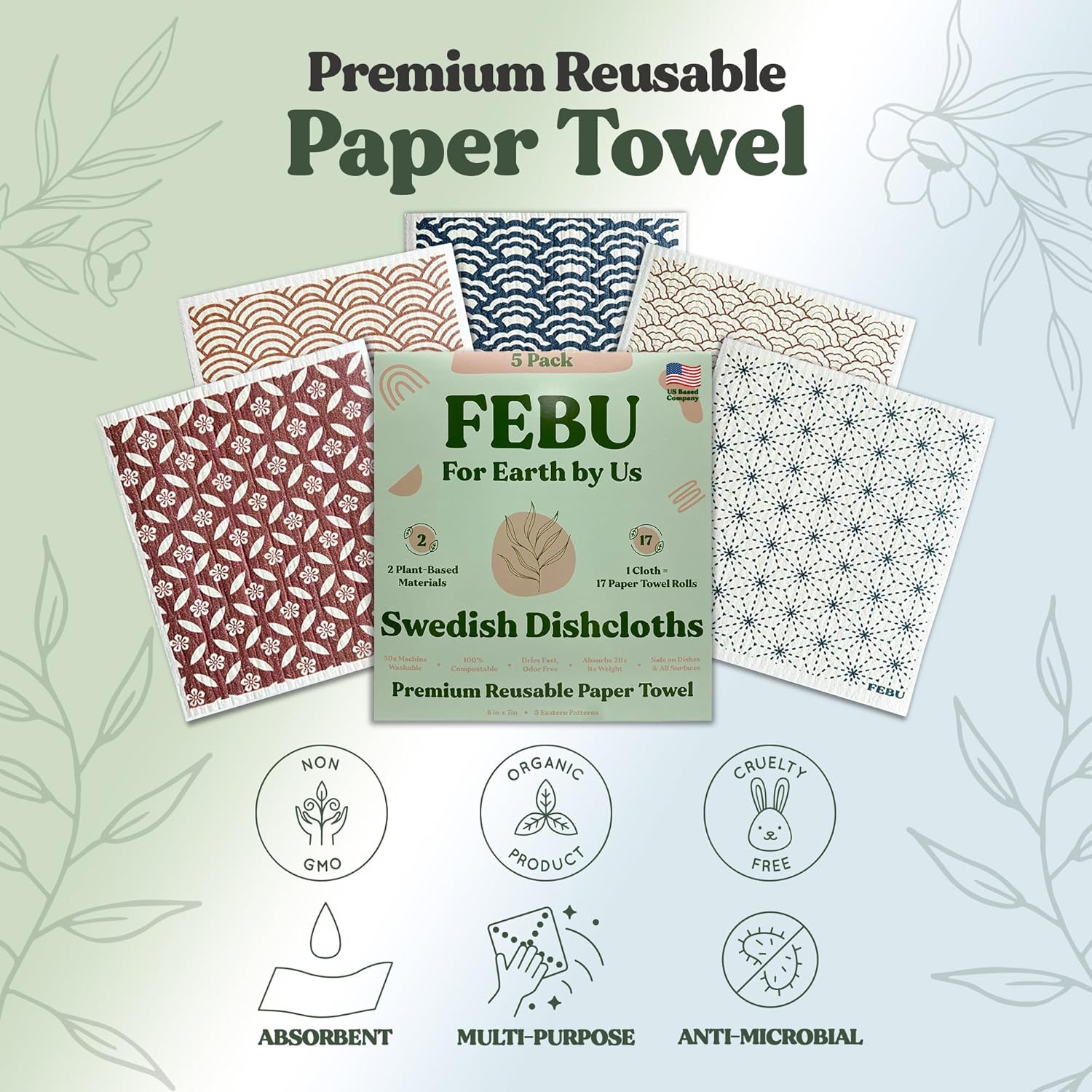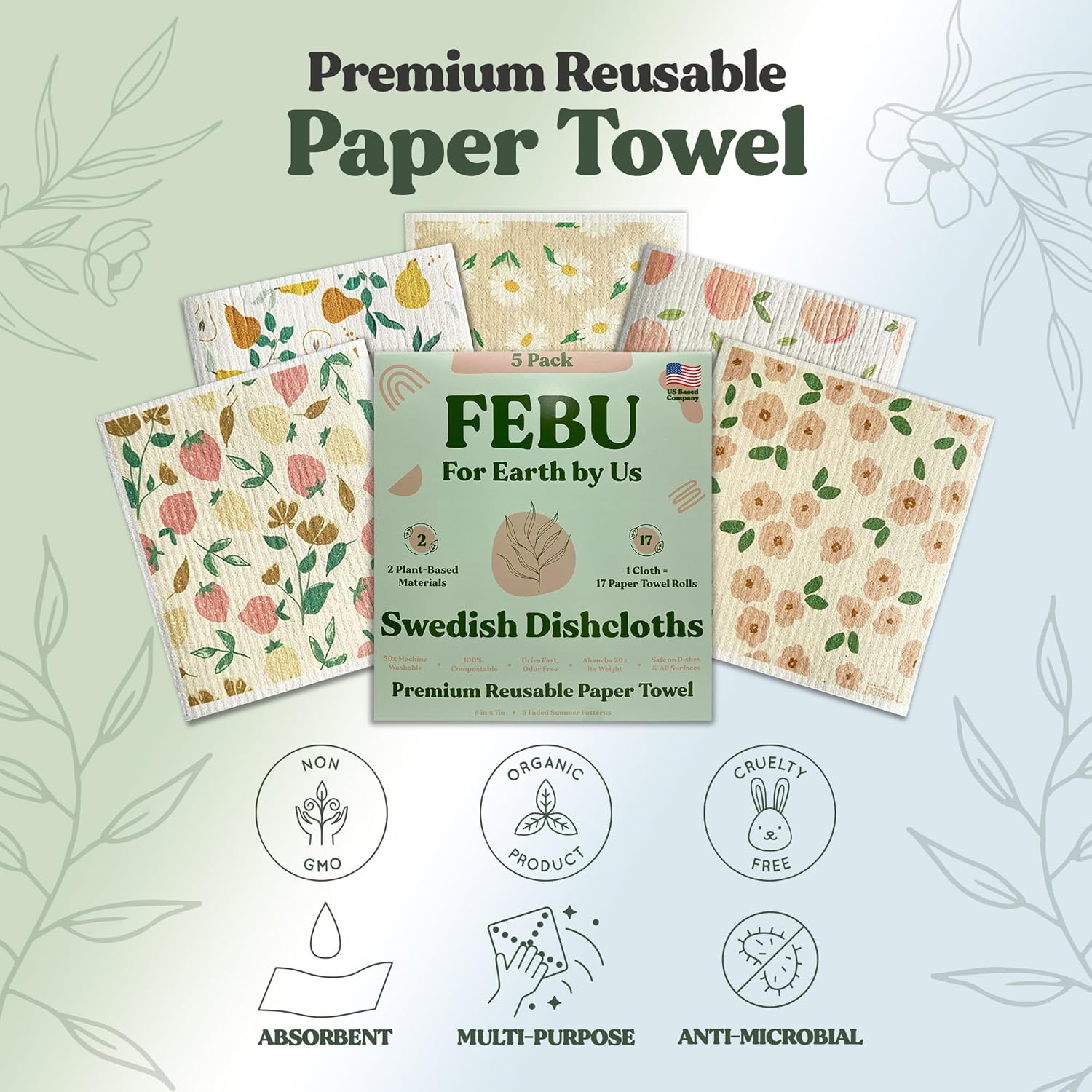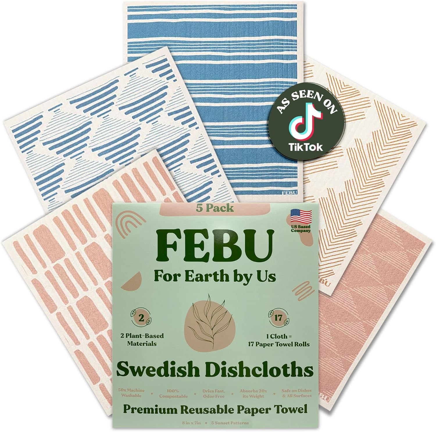 FEBU Swedish Dishcloths 5 Pack Cellulose Sponge Cloths