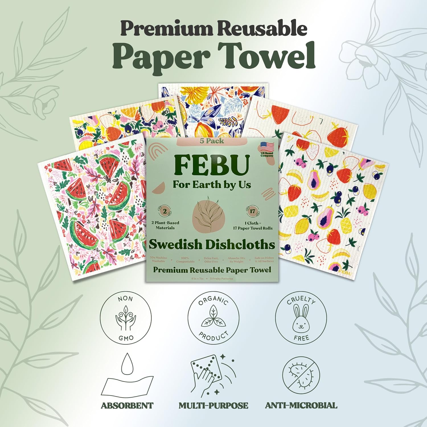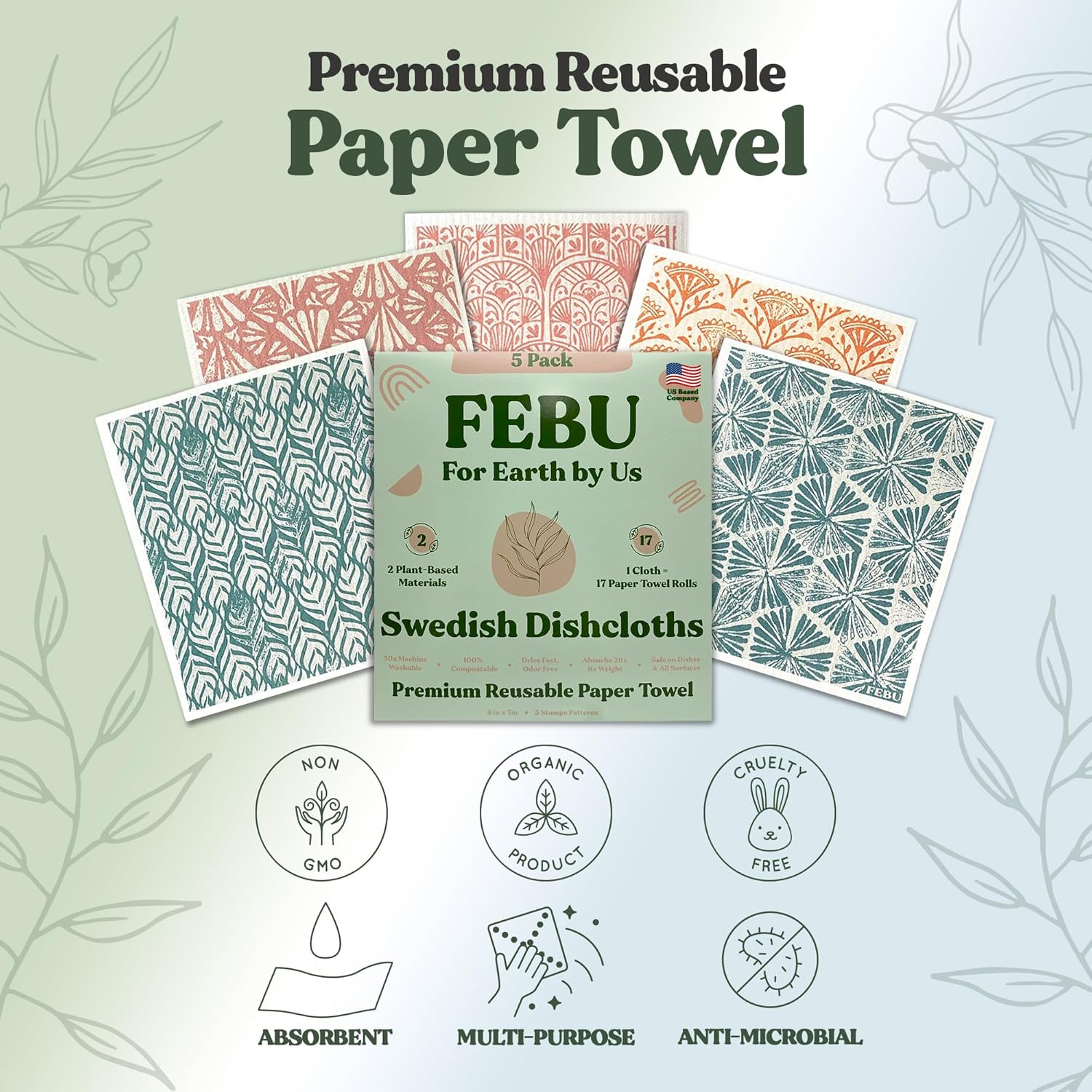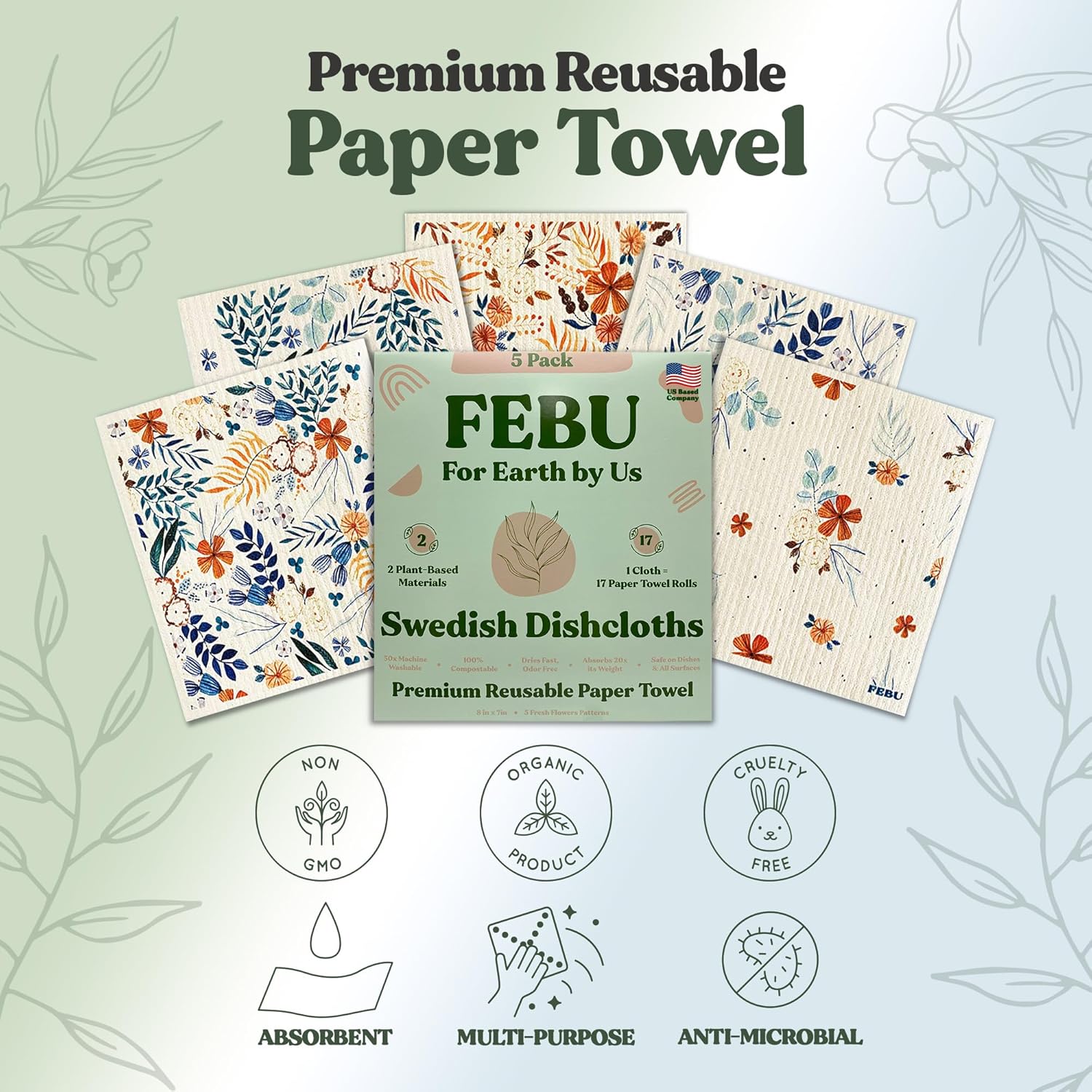 FEBU Swedish Dishcloths 5 Pack Cellulose Sponge Cloths