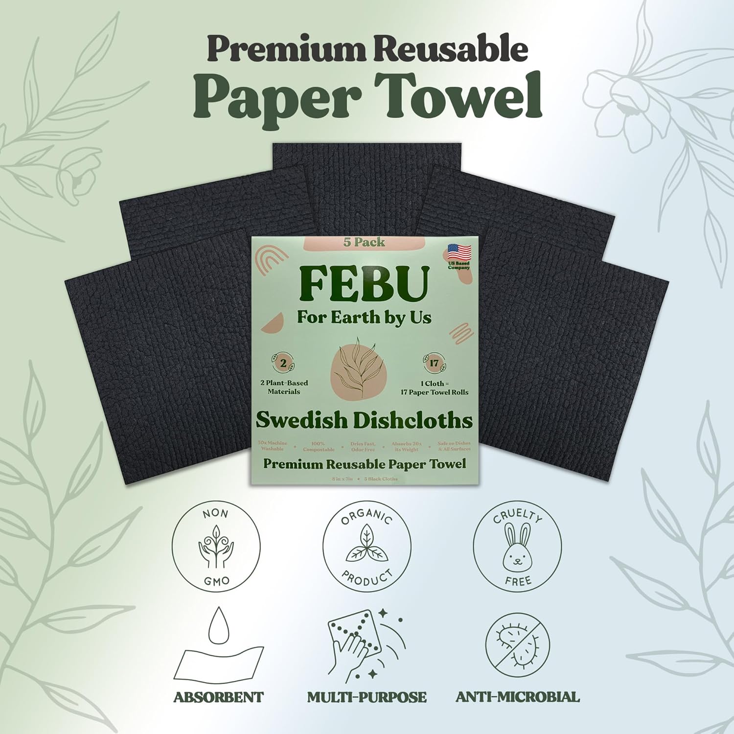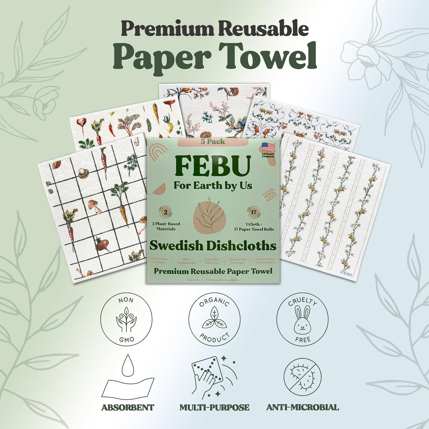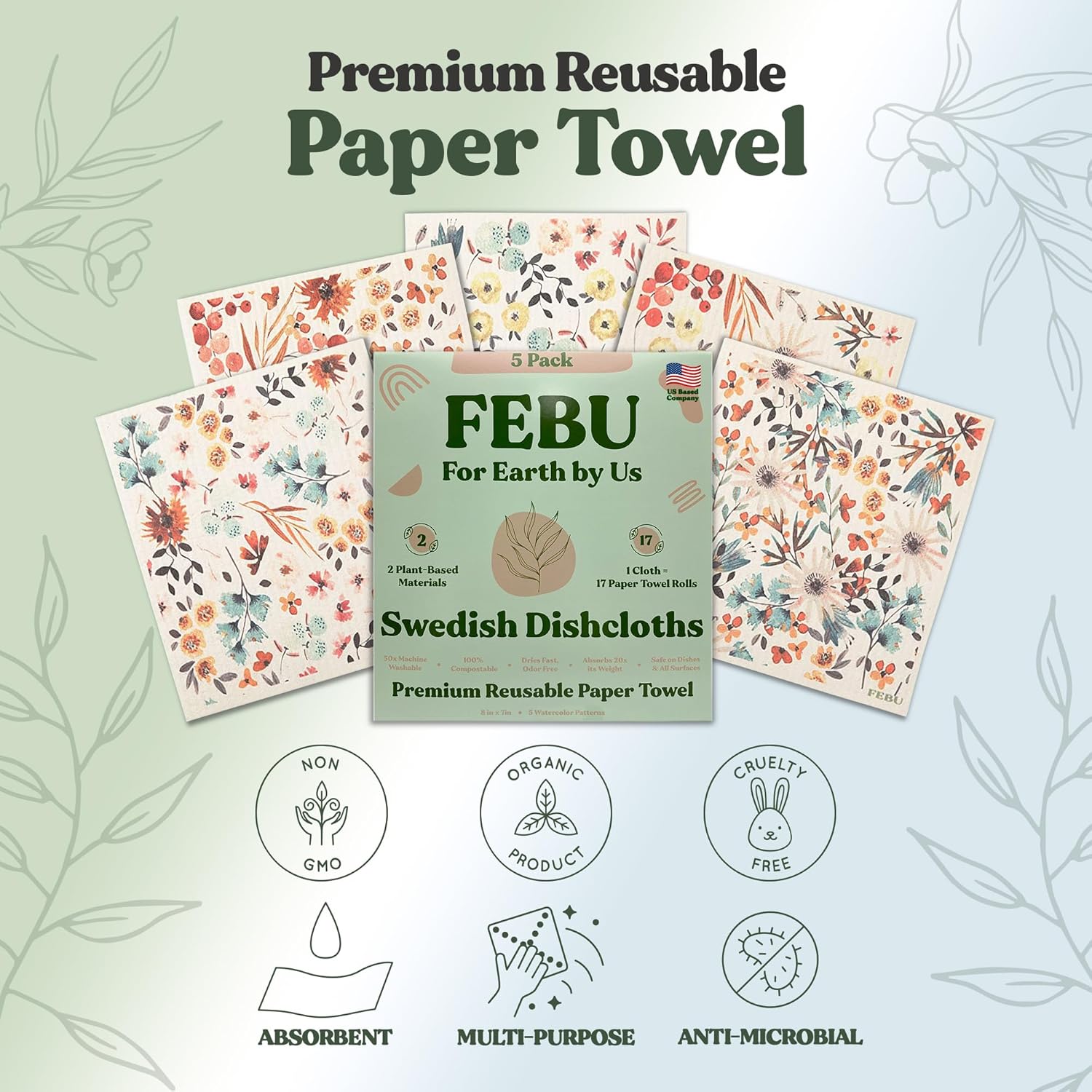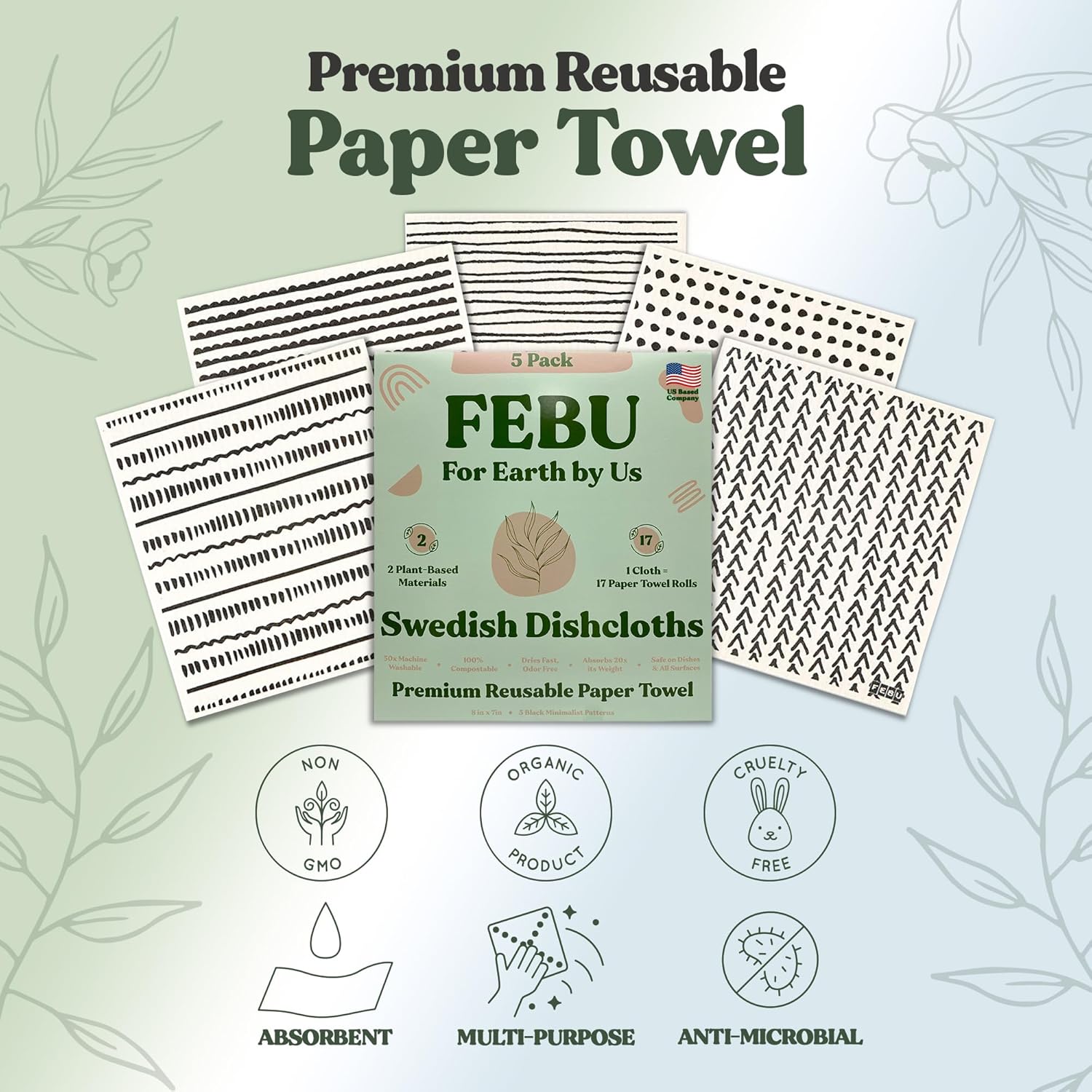 FEBU Swedish Dishcloths 5 Pack Cellulose Sponge Cloths
