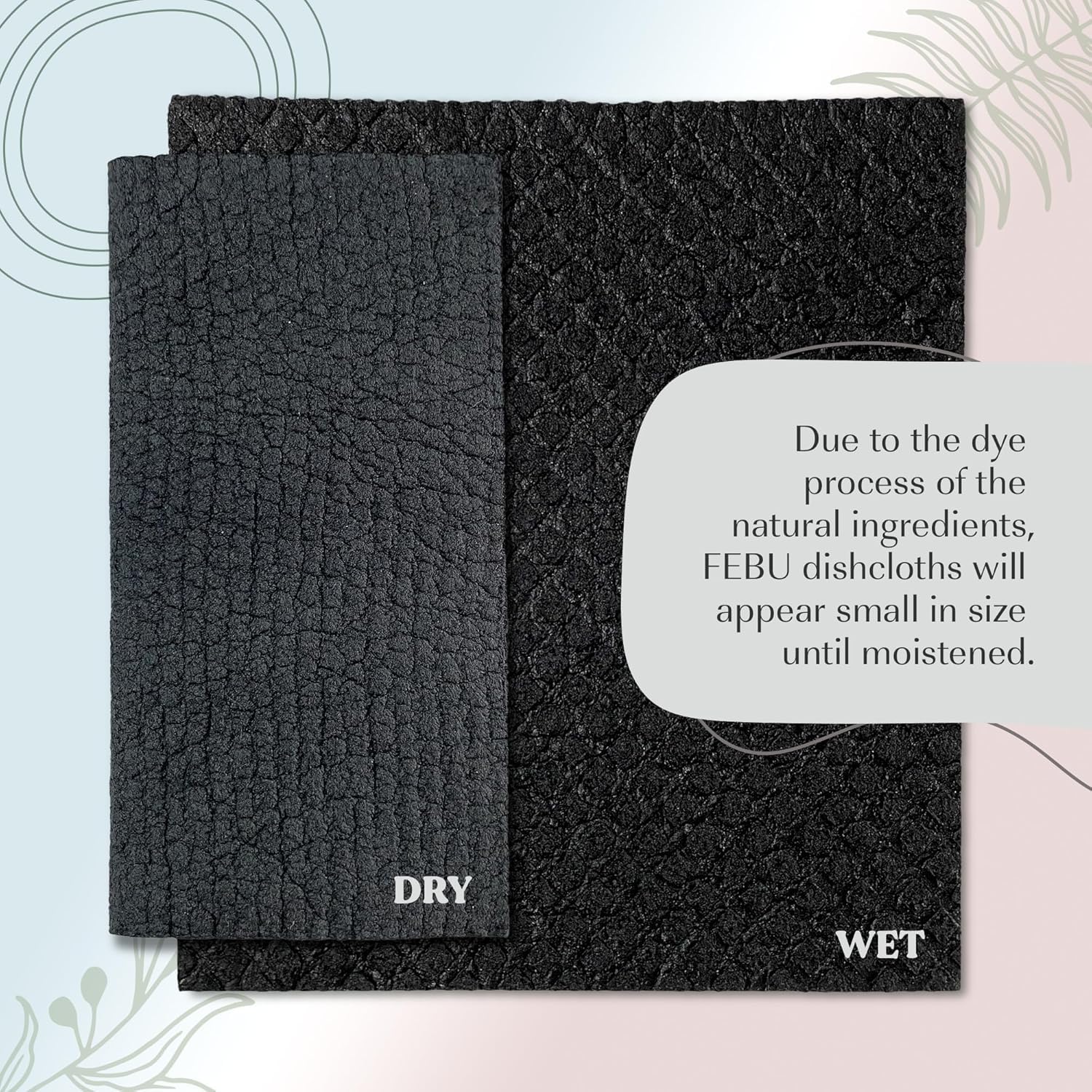 FEBU Swedish Dishcloths are 8” x 7”. They will arrive dry and appear smaller until moistened. To note, due to a special dye process, the solid black cloths arrive smaller than the white printed cloths, but will expand to full size when wet.