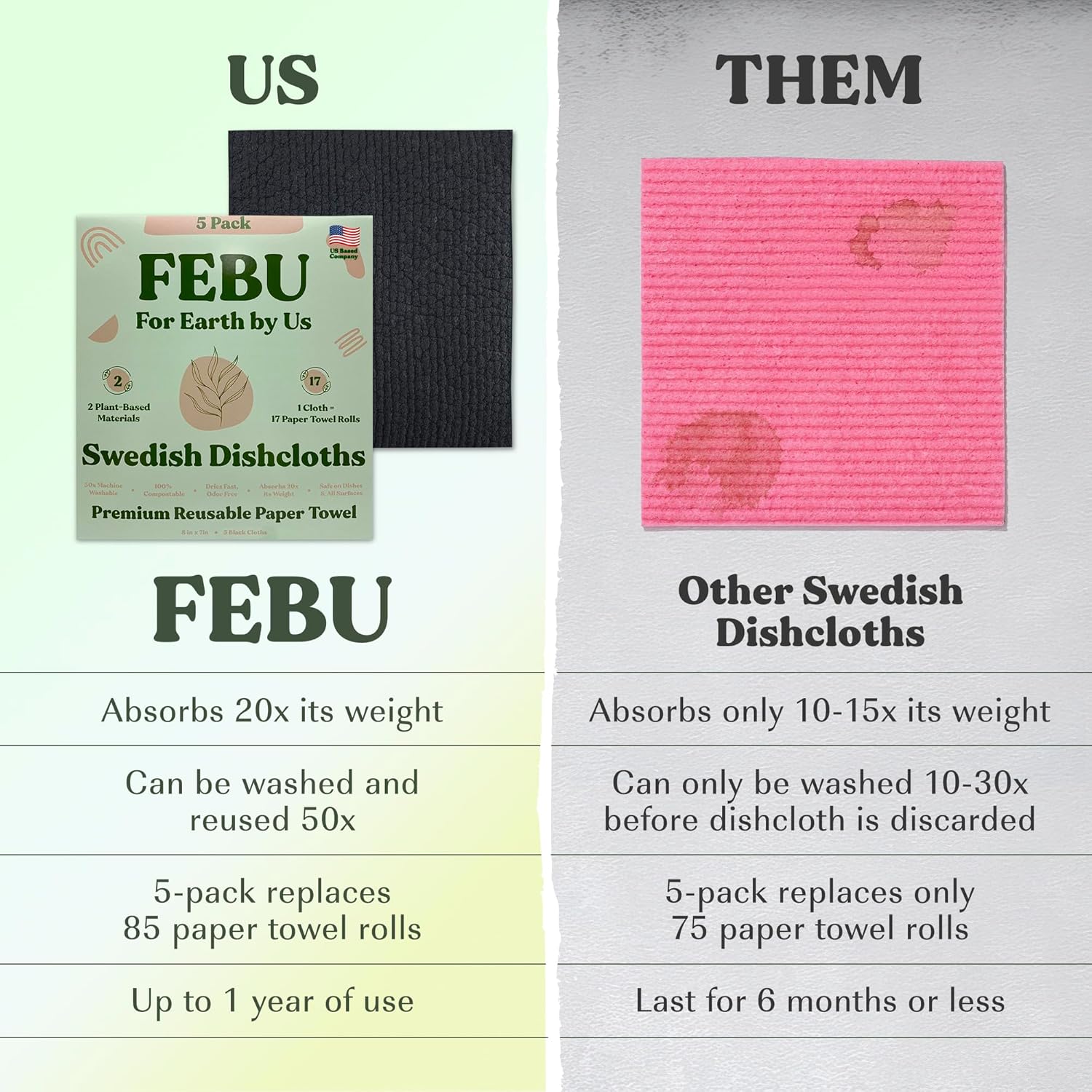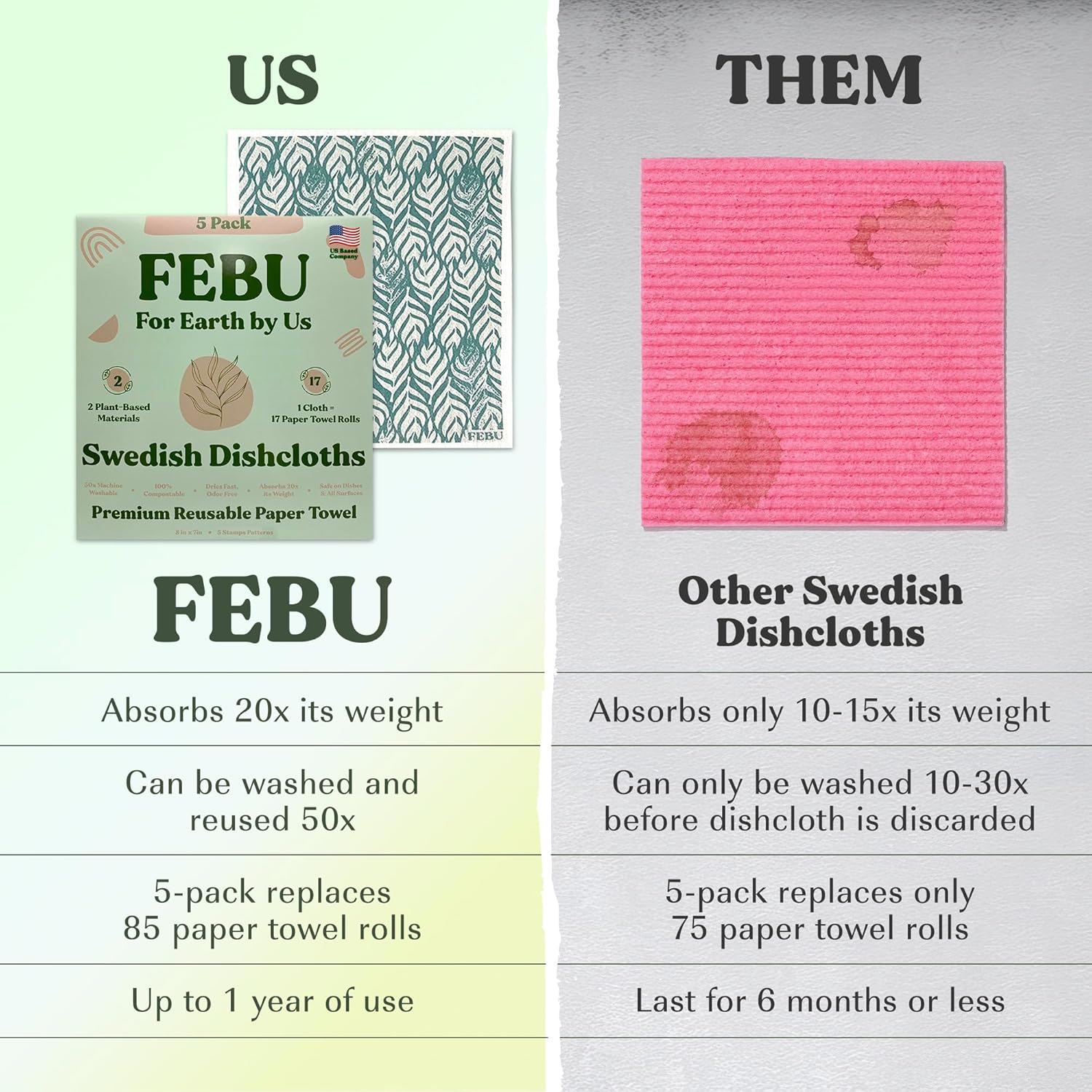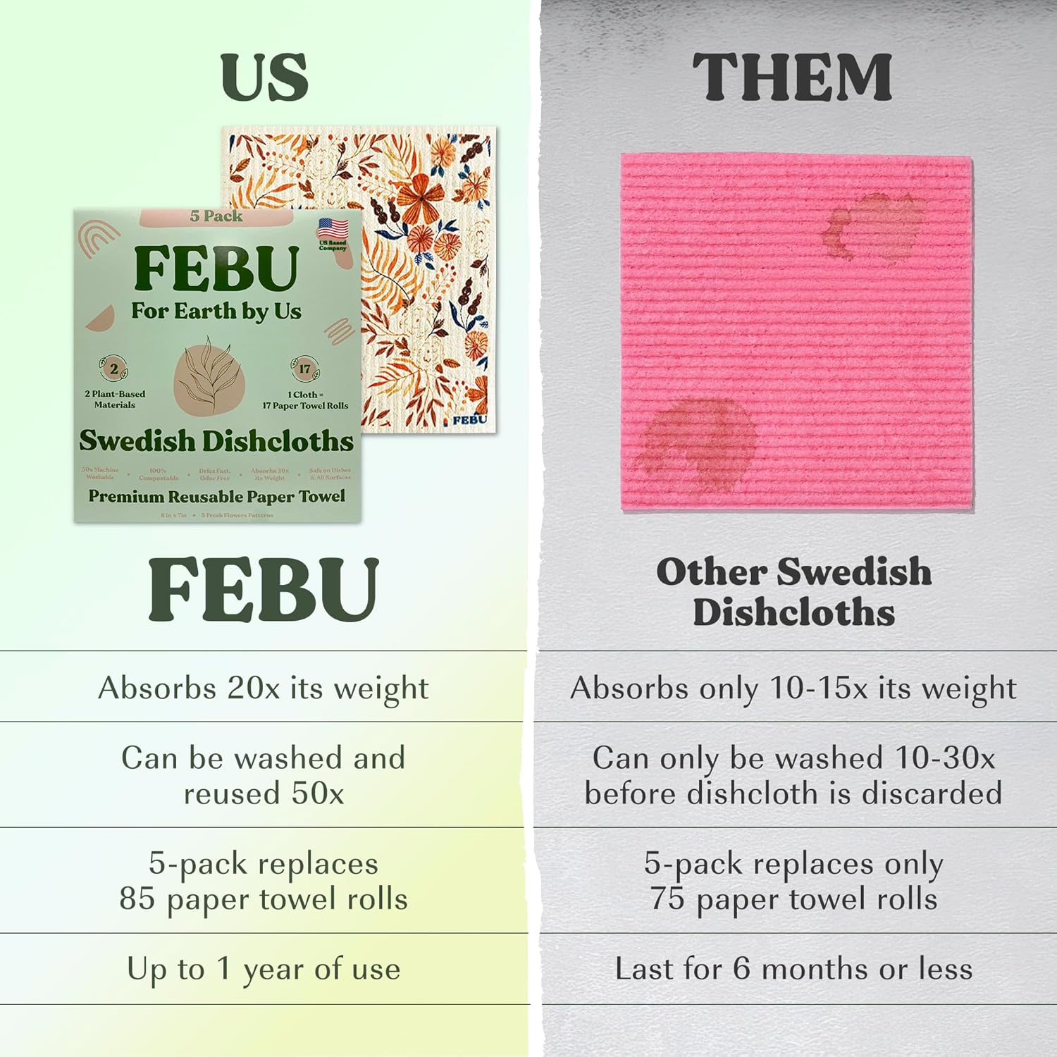 FEBU Swedish dishcloths are very durable and can be washed up to 50x. Each cloth can last up to 9 months with regular cleaning (dishwasher or washing machine). Regular sponges require frequent replacement as they break down quickly & harbor bacteria