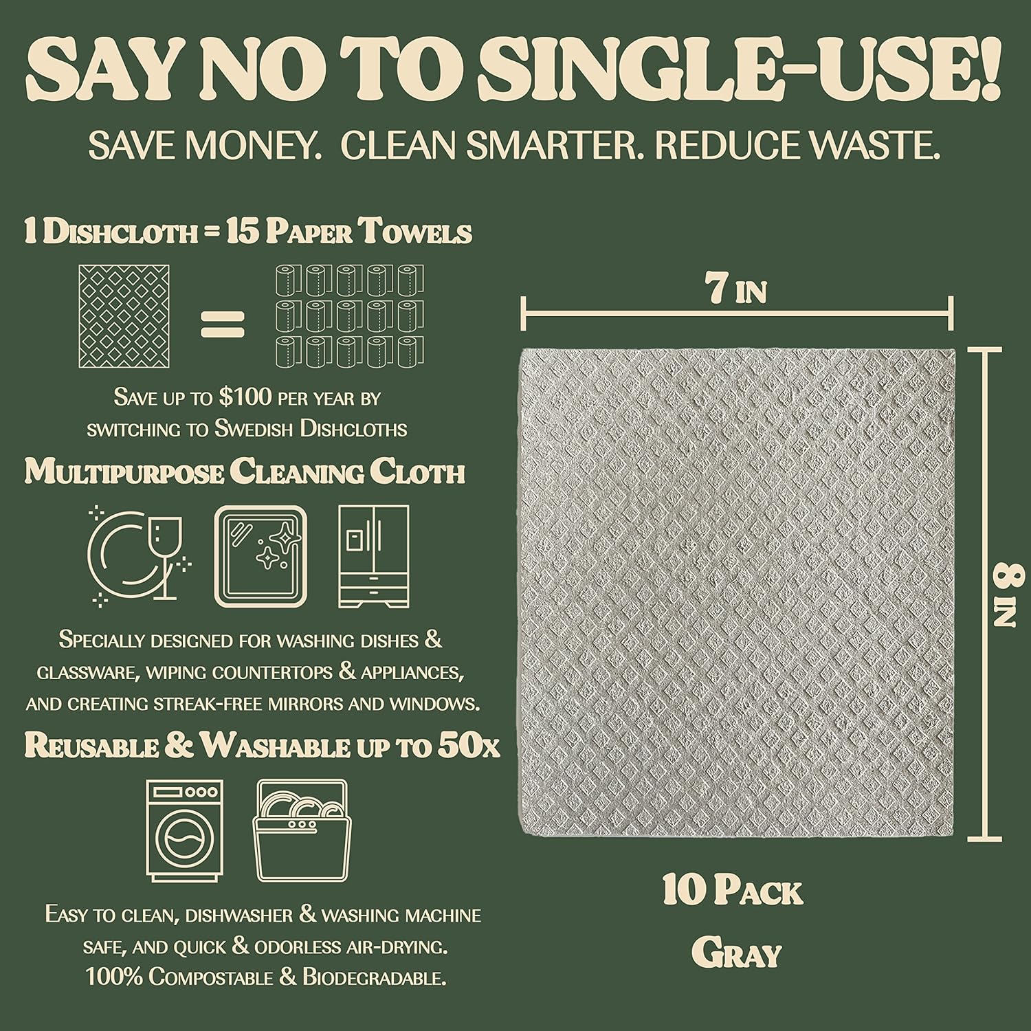 - WASHABLE & REUSABLE — Try our Swedish sponge cloths for a sustainable kitchen. Reusable up to 50 washes, each washable Swedish cloth can replace 17 rolls of paper towels! That’s 85 rolls replaced per pack!